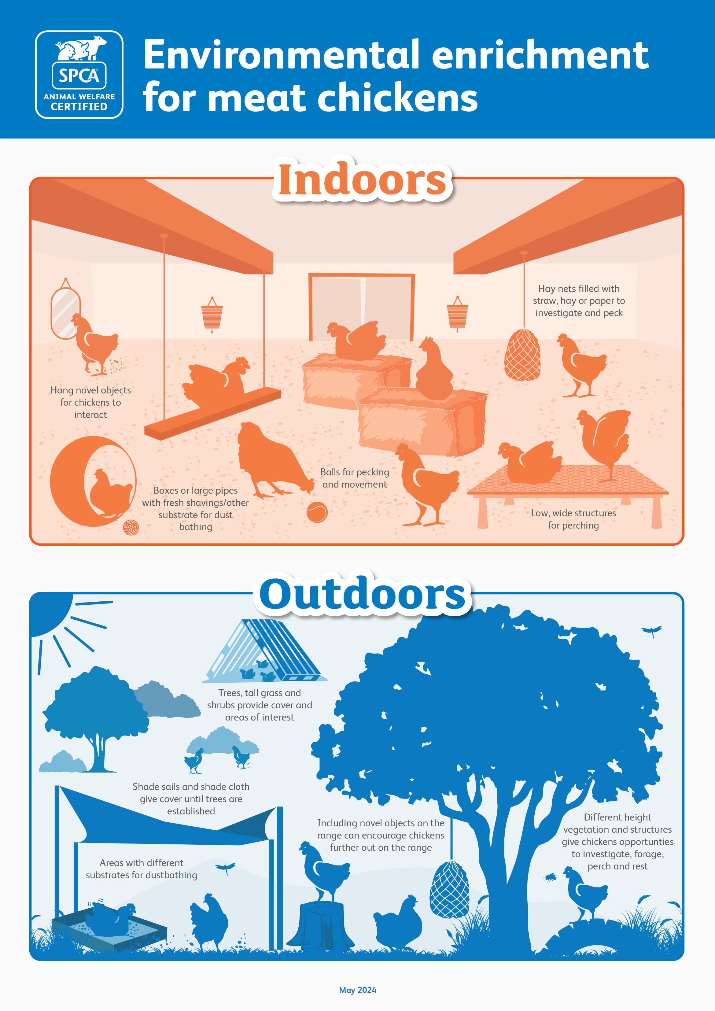 SPCA Certified standards require the provision of sufficient and suitable behavioural enrichment items in poultry sheds.